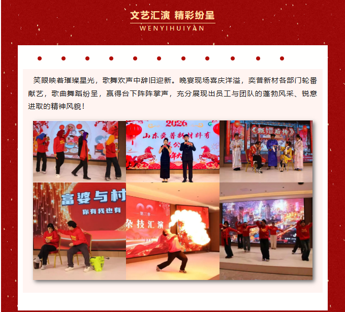 祥蛇摆尾辞旧岁,骏马昂首启新程。回望2025,奕普新材于时代浪潮中奋蹄笃行,在市场风云中合力攻坚,以坚实足迹刻下奋斗的年轮。展望2026,我们将继续高 擎“团结凝聚力量、奋斗创造辉煌”的信念旗帜,以龙马精神拓路前行,以骐骥之速聚力飞跃,向着“国 际一 流绿色阻燃材料企业”的战略愿景全力驰骋,共赴崭新辉煌!